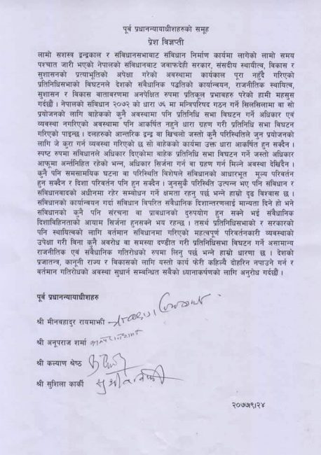 पूर्व प्रधानन्यायाधीशहरू मीनबहादुर रायमाझी, अनुपराज श्रर्मा, कल्याण्ड श्रेष्ठ र सुशीला कार्कीले शुक्रबार प्रेस विज्ञप्ति जारी गर्र्दै प्रतिनिसभा विघटन असंवैधानिक भएको बताएका हुन्।