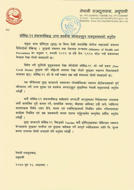 यूएईमा नेपाली समुदायलाई कोभिड–१९ को नयाँ स्वरुपदेखि सतर्क रहन आग्रह