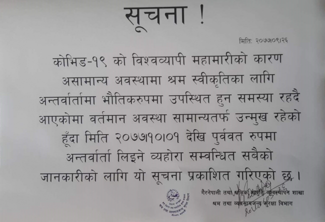 कोरोनाकालमा विदेशी श्रमिक ल्याउने कम्पनीका प्रतिनिधिसँग टेलिफोन कुराकानीबाट पूर्ण विवरण प्राप्त गरी विभागले श्रम स्वीकृति प्रदान गर्दै आएको थियो। अब पुनःभौतिक रूपमै उपस्थित भएर अन्तर्वार्ता दिनुपर्ने भएको विभागद्वारा जारी विज्ञप्तीमा भनिएको छ।