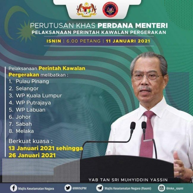 मलेसियाको पुलाउ पेनाङ, सेलाङ्गर, क्वालालम्पुरको पुत्राजया क्षेत्र, मलका, जोहोर, सावालगायतका क्षेत्रमा यो प्रतिबन्ध लागू गरिने जनाइएको छ। सरकारले आवागमन निषेध आज्ञाको पूर्णरुपमा पालना गर्ने भन्दै सजग रहनसमेत सबैमा अपील गरेको छ।