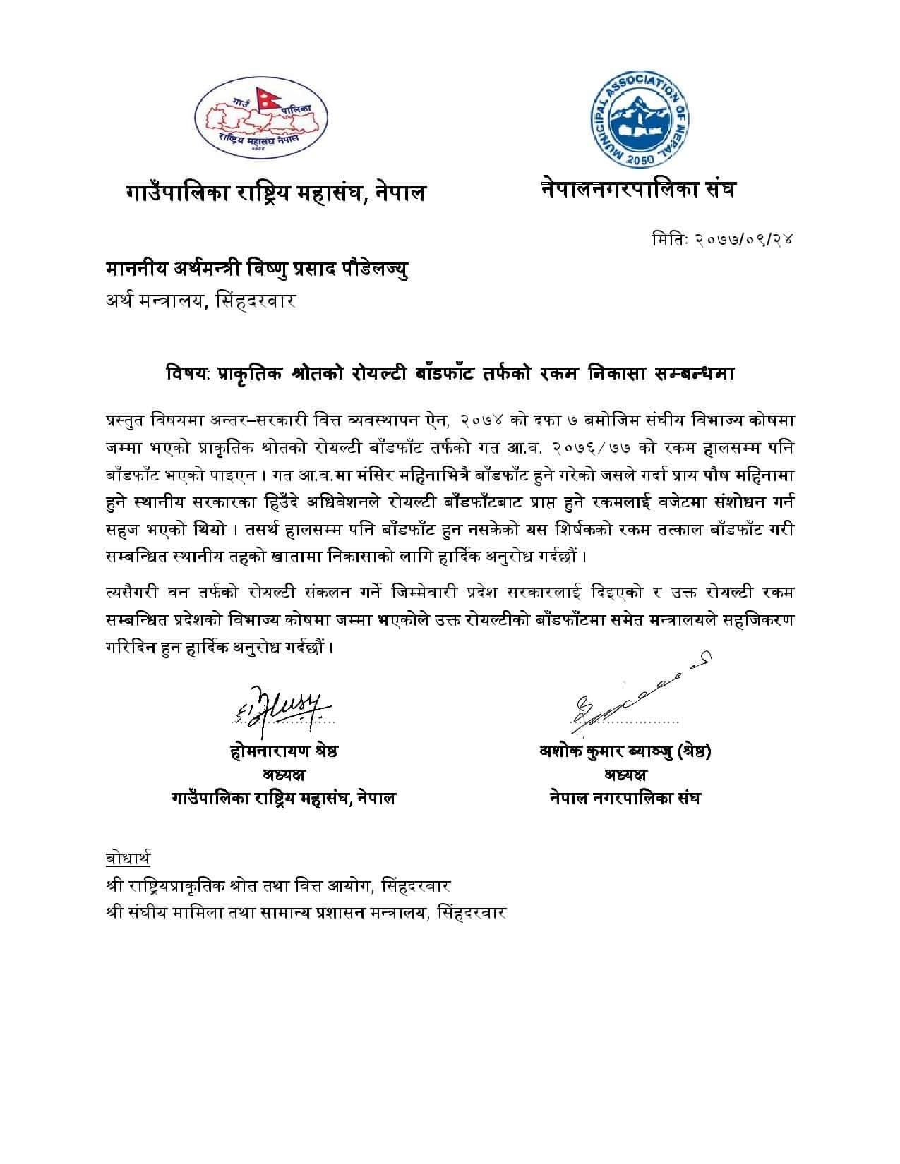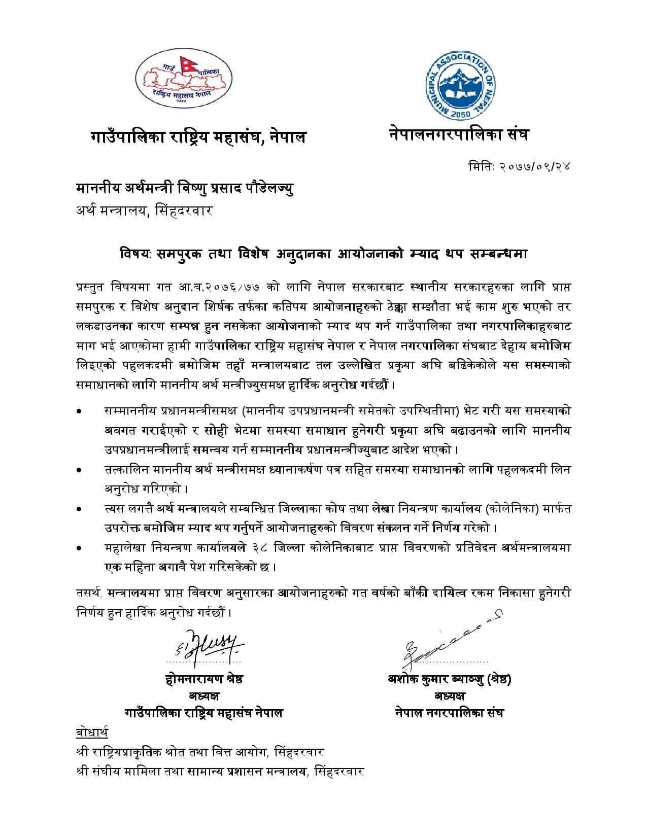 गाउँपालिका राष्ट्रिय महासंघ र नगरपालिका संघले बुझायो अर्थमन्त्री पौडेललाई ध्यानाकर्षण पत्र