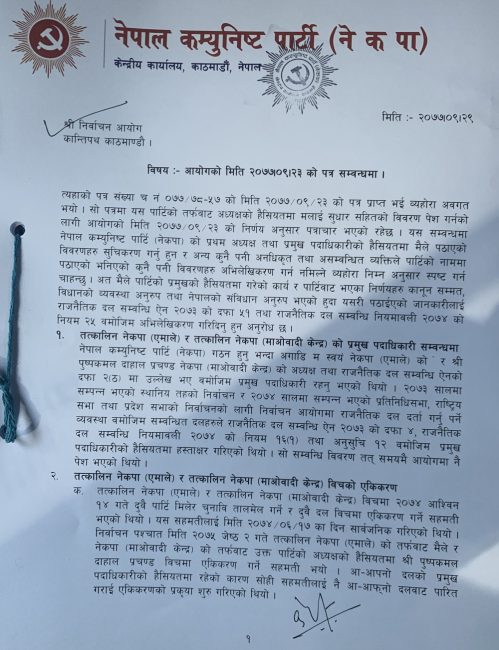 पत्रमा भनिएको छ, ‘यसरी एकीकरण प्रक्रिया नसकिदै अर्थात एकता महाधिवेशनबाट नयाँ नेतृत्वको छनौट नभई कुनै पनि अध्यक्षलाई निश्कासन गर्ने प्रश्न आउदैन। यस्तो हास्यास्पद कुरा आयोगमा अभिलेखिकरण हुन सक्दैन ।’