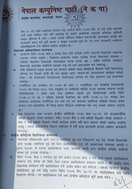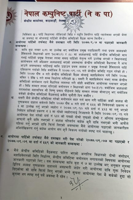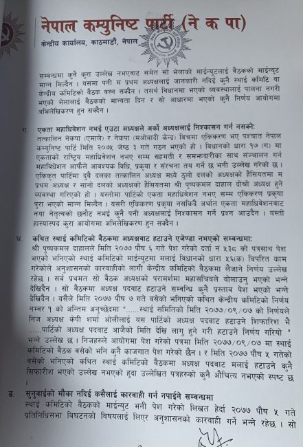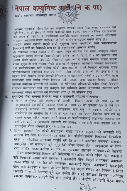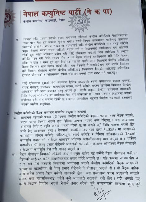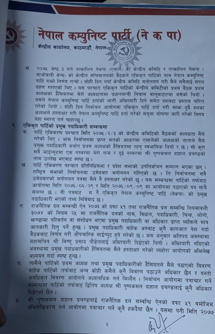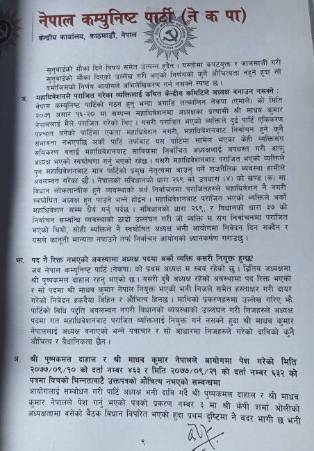 ‘नेकपाको प्रथम अध्यक्ष म स्वयं रहेको छु । द्धितीय अध्यक्ष पुष्पकमल दाहाल रहनुभएको छ । दुवै अध्यक्ष रहेको अवस्थामा पद रिक्त भएको र सो पदमा माधवकुमार नेपाल नियुक्त भएको भनी निजले समेत हस्ताक्षर गरि दायर गरेको निवेदन औचित्यहीन छ’, पत्रमा उल्लेख गरिएको छ।
