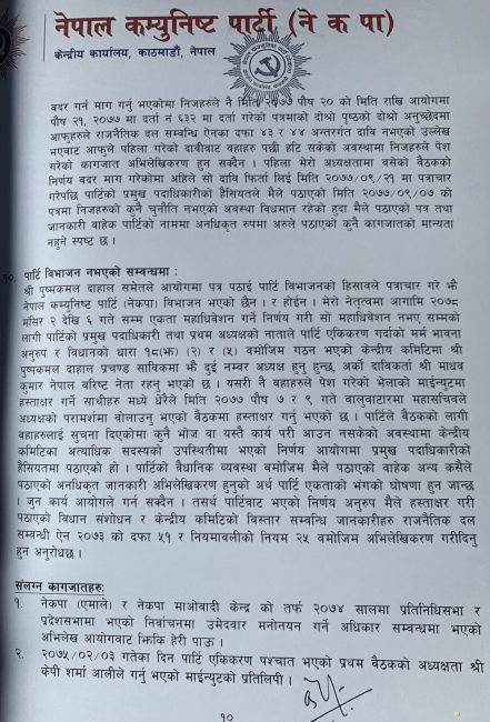 पत्रमा भनिएको छ, ‘यसरी एकीकरण प्रक्रिया नसकिदै अर्थात एकता महाधिवेशनबाट नयाँ नेतृत्वको छनौट नभई कुनै पनि अध्यक्षलाई निश्कासन गर्ने प्रश्न आउदैन। यस्तो हास्यास्पद कुरा आयोगमा अभिलेखिकरण हुन सक्दैन ।’