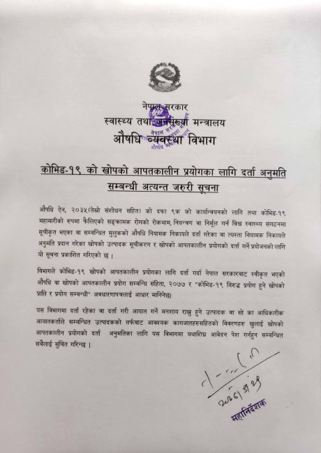 सूचनामा भनिएको छ, ‘यस विभागमा दर्ता रहेका वा दर्ता गरी आयत गर्ने मनशाय राख्नुहुने उत्पादक वा सोको आधिकारिक आयातकर्ताले सम्बन्धित उत्पादककर्ताको तर्फबाट आवश्यक कागजातसहितको विवरण खुलाई खोपको आपतकालीन प्रयोगको दर्ता अनुमतिका लागि यथाशीघ्र आवेदन पेश गर्न हुन सबैलाई सूचित गरिन्छ।’