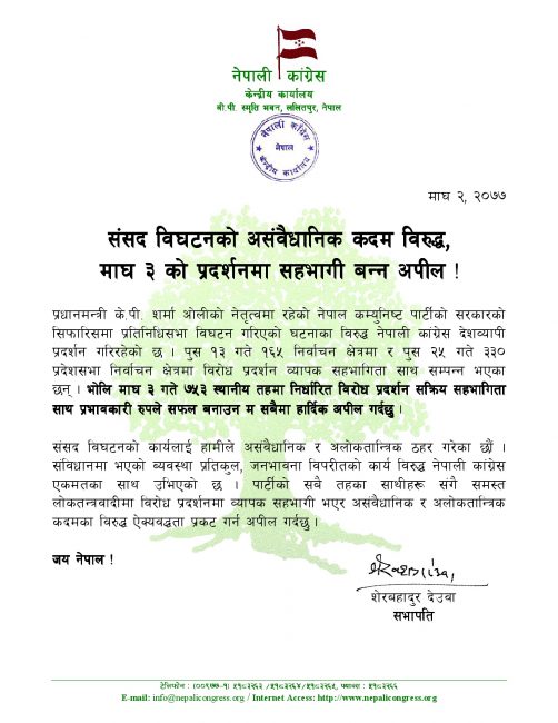 विज्ञप्तिमा सभापति देउवाले भन्नुभएको छ, ‘संसद विघटनको कार्यलाई हामीले असंवैधानिक र अलोकतान्त्रिक ठहर गरेका छौं। संविधानमा भएको ब्यवस्था प्रतिकुल, जनभावना विपरीतको कार्य विरुद्ध नेपाली कांग्रेस एकमतका साथ उभिएको छ । पार्टीको सबै तहका साथीहरू संगै समस्त लोकतन्त्रवादीमा विरोध प्रदर्शनमा व्यापक सहभागी भएर असंवैधानिक र अलोकतान्त्रिक कदमका विरुद्ध ऐक्यवद्धता प्रकट गर्न अपिल गर्दछु।’