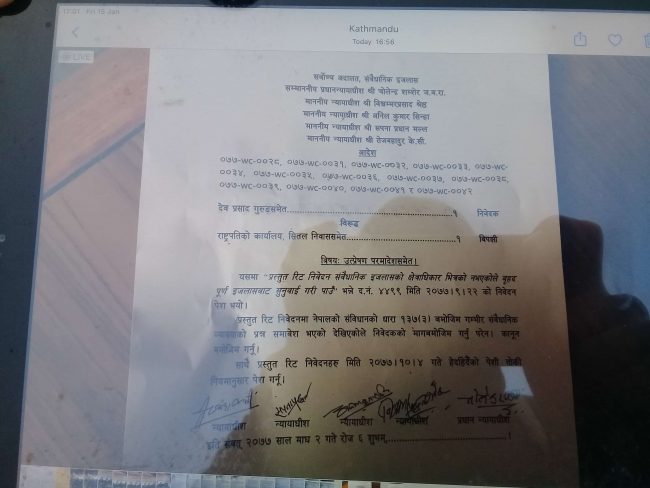 संवैधानिक इजलासमा प्रधानन्यायाधीश चोलेन्द्र शम्शेर राणा, न्यायाधीशहरु विश्भरप्रसाद श्रेष्ठ, अनिलकुमार सिन्हा, सपना मल्ल प्रधान र तेजबहादुर केसी छन्।