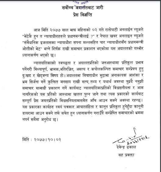 सर्वोच्चका सहप्रवक्ता देवेन्द्र ढकालले जारी गरेको विज्ञप्तिमा भनिएको छ, ‘न्यायपालिकाको स्वच्छता र अदालतप्रतिको जनआस्थामा प्रतिकूल प्रभाव पर्नेगरी मिथ्यापूर्ण, भ्रामक, अतिरञ्जित, असत्य र कपोकल्पित समाचार सम्प्रेशण हुनु दुःखद् र खेद जन्य विषय हो।’