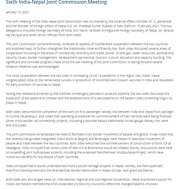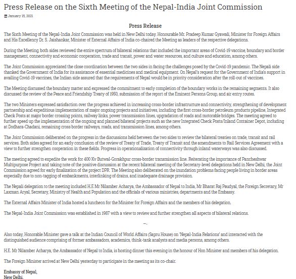 नेपालको परराष्ट्र मन्त्रालयले जारी गरेको विज्ञप्तिमा सँयुक्त आयोगको बैठकमा सीमा समस्याबारे पनि छलफल भएको उल्लेख छ। तर, भारतको विदेश मन्त्रालयले जारी गरेको विज्ञप्तिमा सीमाको विषय कतै पनि उल्लेख गरिएको छैन। यतिमात्र नेपालले जारी गरेको विज्ञप्तिमा कोरोनाविरुद्धको खोपका विषयसमेत छलफल भएको बताएको छ। तर, उता यो विषयमा उल्लेख छैन। बरु दुबै विज्ञप्तिमा नेपालले कोरोना महामारीका बेला भारतले गरेको सहयोगका लागि धन्यावाद दिएको उल्लेख छ।