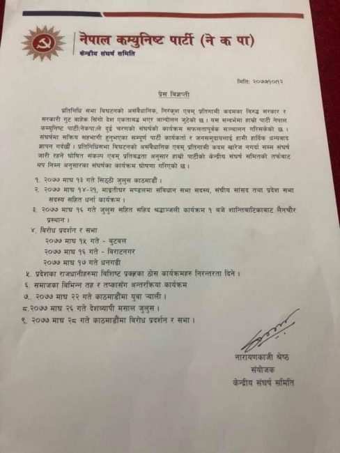 प्रतिनिधिसभा विघटन गर्ने सरकारको कदम खारेज नहुँदासम्म आन्दोलनका कार्यक्रम जारी रहने संघर्ष समितिले जनाएको छ । सरकारले गत पुस ५ गते प्रतिनिधिसभा विघटन गरेसँगै नेकपाको एक समूह सडक संघर्षमा उत्रिएको छ । सो समूहले दुई चरणमा देशव्यापी आन्दोलन गरिसकेको छ । संघर्ष समितिले आन्दोलनमा सहभागी हुने सम्पूर्ण पार्टी कमिटीका सदस्य तथा जनसमुदायलाई धन्यवादसमेत दिएको छ ।