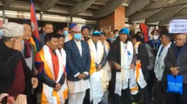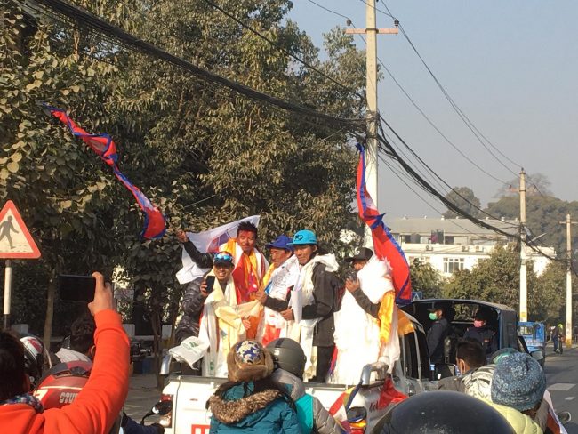केहीबेरअघि विमानस्थल उत्रिएको आरोही टोलीलाई अहिले र्यालीका साथ ठमेलतर्फ लगिएको सङ्घका महासचिव कुलबहादुर गुरुङले जानकारी दिए। उनका अनुसार ठमेल परिक्रमा गराएर बोर्डको कार्यक्रम सकिएलगत्तै प्रधानमन्त्री केपी शर्मा ओलीले बालुवाटारमा हुने विशेष कार्यक्रममा आरोही टोलीलाई सम्मान गर्ने कार्यक्रम रहेको छ।