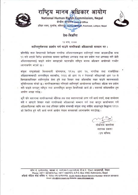 आयोगले सोमबार विज्ञप्ति निकालेर कानून कार्यान्वयन गर्ने अधिकारीहरुका लागि बल तथा हतियार प्रयोगसम्बन्धी संयुक्त राष्ट्र संघीय आधारभूत सिद्धान्त १९९० को विपरीत हुने गरी कार्य नगर्न सरकारलाई आग्रह गरेको छ ।