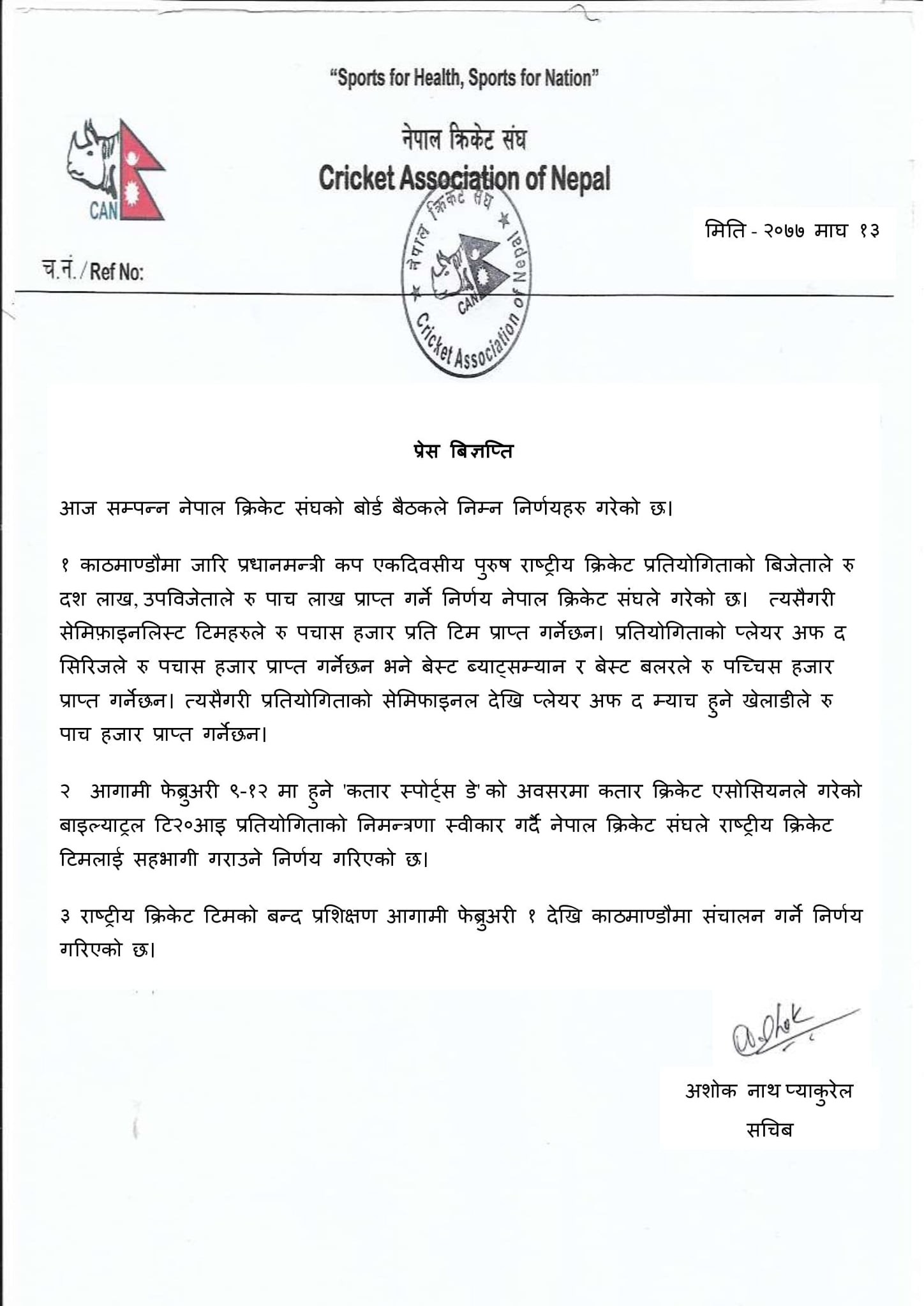 यसैगरी क्यानले जारी पीएमकप पुरुष एकदिवसीय क्रिकेट प्रतियोगिताको पूरस्कार पनि घोषणा गरेको छ । प्रतियोगिताको विजेताले १० तथा उपविजेताले ५ लाख रकम प्राप्त गर्नेछन् ।