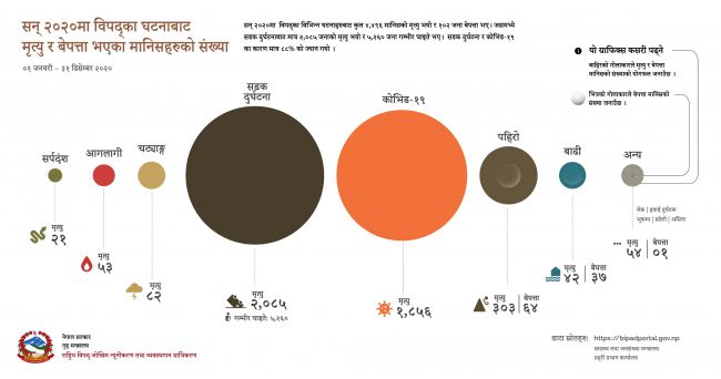राष्ट्रिय विपद् जोखिम न्यूनीकरण तथा व्यवस्थापन प्राधिकरणका अनुसार सबैभन्दा बढी सडक दुर्घटनाबाट दुई हजार ८४ को मृत्यु भएको छ । कोभिड–९१९ का कारण एक हजार ८५६ को मृत्यु भएको छ । पहिरोबाट ३०३ ले ज्यान गुमाएका छन् भने ६४ बेपत्ता छन् । बाढीबाट ४२ को मृत्यु र ३७ बेपत्ता भएको प्राधिकरणले जनाएको छ । सर्पदंशबाट २९, आगलागीबाट ५३, चट्याङबाट ८२ जनाको मृत्यु भएको र अन्य विविध घटनाका कारण ५४ जनाले ज्यान गुमाएको प्राधिकरणले आज सार्वजनिक गरेको विवरणमा उल्लेख छ । उक्त विवरण सन् २०२० को जनावरीदेखि डिसेम्बर ३१ सम्मको हो ।