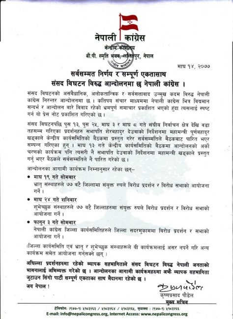 कांग्रेस केन्द्रीय समितिको मङ्गलबारको बैठकले यही माघ १९ गते पार्टीका भ्रातृ संस्थाले र माघ २४ गते शुभेच्छुक संस्थाले ७७ वटै जिल्लामा संयुक्तरुपले विरोध प्रदर्शन र विरोधसभाको आयोजना गर्ने निर्णय गरेको थियो।