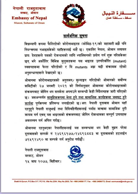 यससँगै ओमानमा सामूहिक रूपमा भेला हुने तथा सामाजिक कार्यहरूमा जमघट हुने कार्यमा पूर्णरूपमा प्रतिबन्ध लगाइएको छ। साथै ओमानमा रहेका नेपालीहरूलाई यस सम्बन्धमा थप बुझ्नु परेमा दूतावासमा सम्पर्क गर्न अनुरोध गरिएको छ।