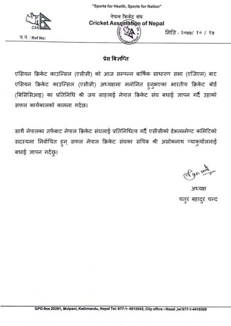 यस्तै एसीसीको अध्यक्षमा भारतीय क्रिकेट कन्ट्रोल बोर्ड (बीसीसीआई)का सचिब जय शाह अध्यक्षमा चयन भएका छन्। शाह भारतीय गृहमन्त्री अमित शाहका छोरा हुन्। क्यान अध्यक्ष चन्दले शाह अध्यक्षमा चयन भएकोमा उनलाई पनि बधाई दिएका छन्।