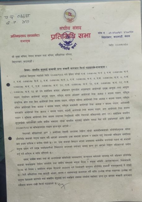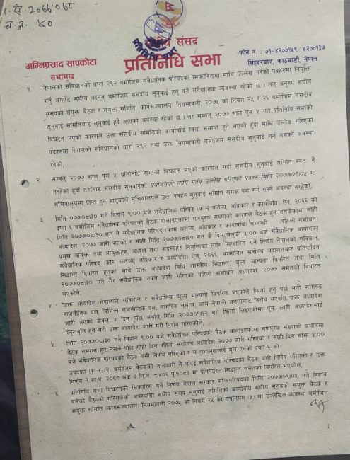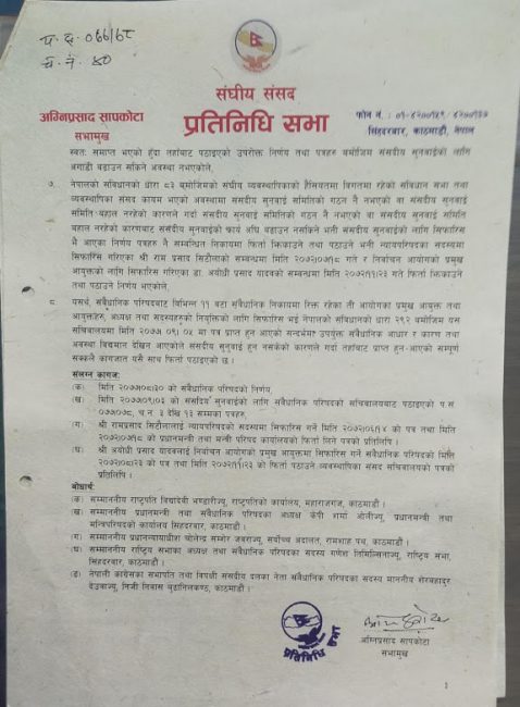 २. सम्वत् २०७७ साल पुस ५ प्रतिनिधि सभाको विघटन भएको कारणले गर्दा संसदीय सुनुवाई समिति स्वतः नै नरहेको हुदाँ तहाँबाट संसदीय सुनुवाईको प्रयोजनको लागि माथि उल्लेख गरिएको पत्रहरु मिति २०७७।०९।०५ मा सचिवालयमा प्राप्त हुन आएकोले सचिवालयले उक्त पत्रहरु सुनुवाई समिति समक्ष पेश गर्न सक्ने अवस्था नरहेको,