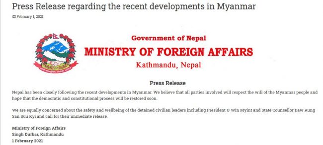 सोमबार अबेर परराष्ट्र मन्त्रालयले एक विज्ञप्ति जारी गर्दै सेनाले बन्दी बनाएका राष्ट्रपति उ विन मियन्त तथा काउन्सिल आङ साङ सूचीको सुरक्षा नेपालको चासोको विषय भएको बताएको छ। यस्तै नेपालले बन्दीहरु छिट्टै रिहा हुनुपर्नेसमेत बताएको छ।