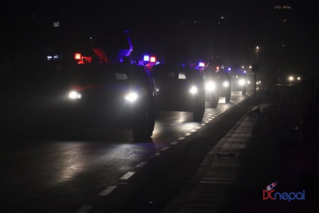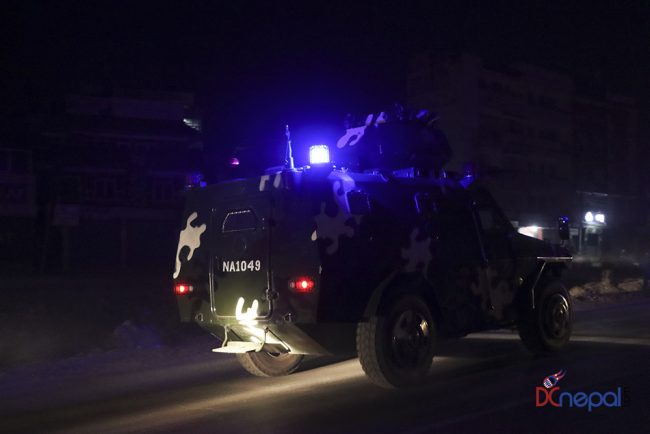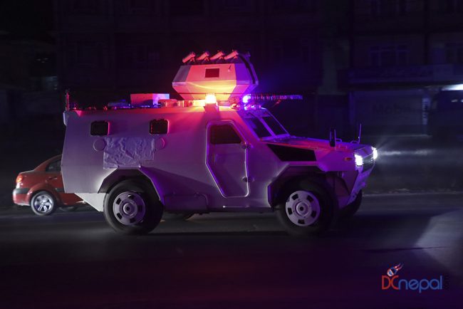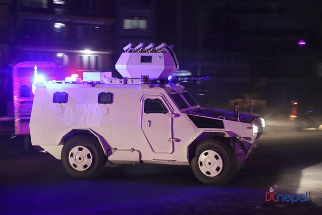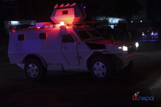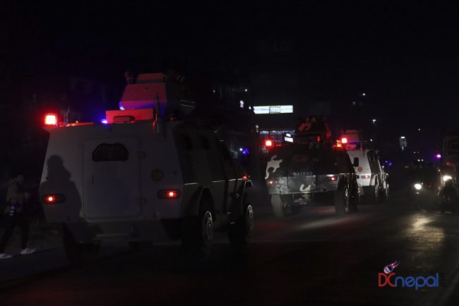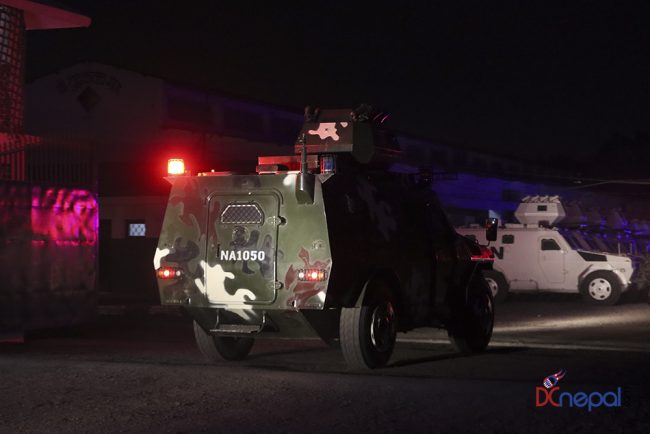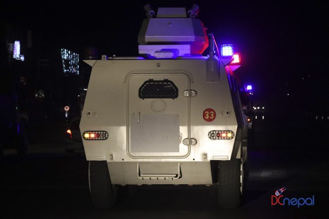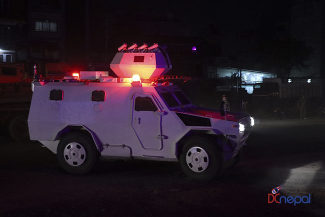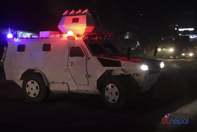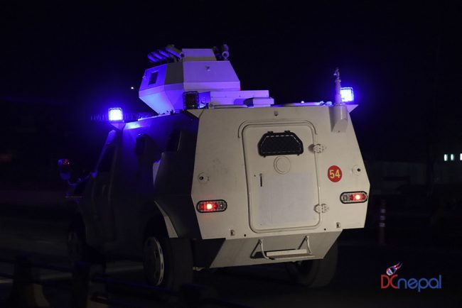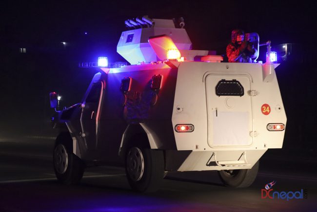 काठमाडौं। नेपाली सेनाका बख्तरबन्द गाडी सोमबार राति काठमाडौंको चक्रपथ पक्रिमा गरेका छन्। राति १० बजे सितापाइलास्थित सेनाको ब्यारेकबाट निस्केका बख्तरबन्द गाडीले २७ किलोमिटरको चक्रपथ परिक्रमा गरे।