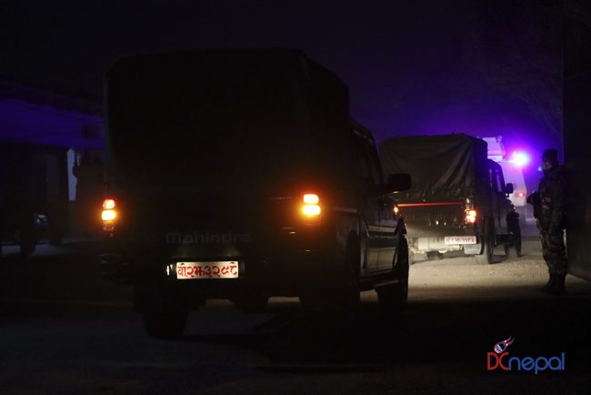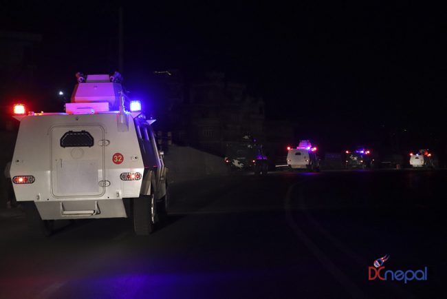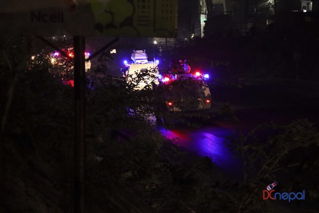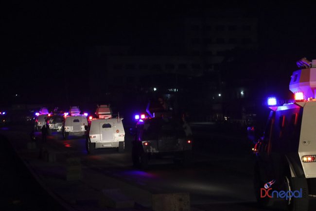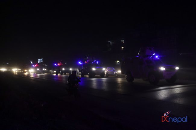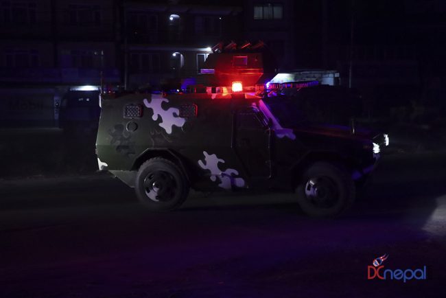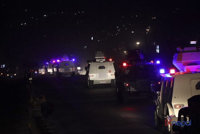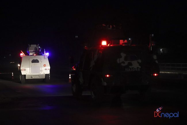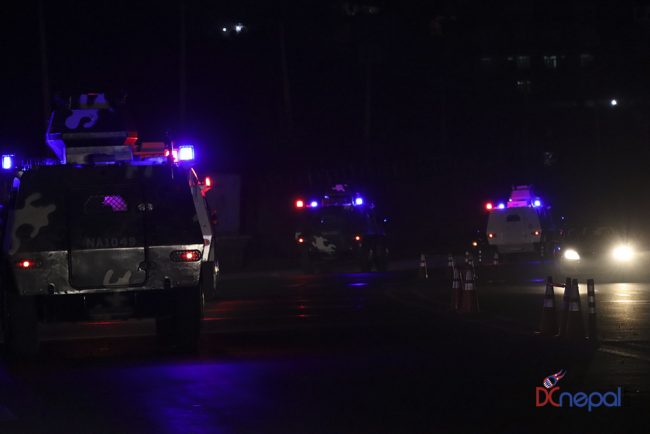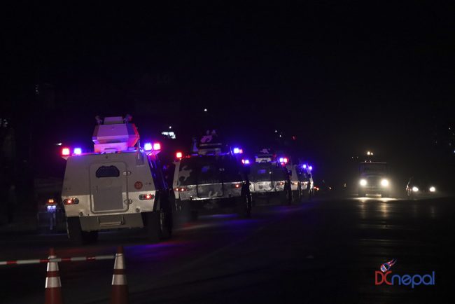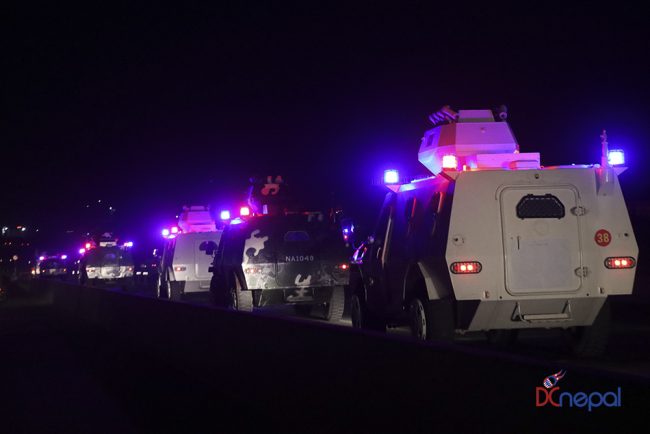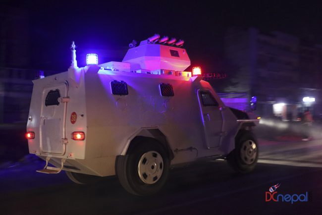 काठमाडौं। नेपाली सेनाका बख्तरबन्द गाडी सोमबार राति काठमाडौंको चक्रपथ पक्रिमा गरेका छन्। राति १० बजे सितापाइलास्थित सेनाको ब्यारेकबाट निस्केका बख्तरबन्द गाडीले २७ किलोमिटरको चक्रपथ परिक्रमा गरे।
