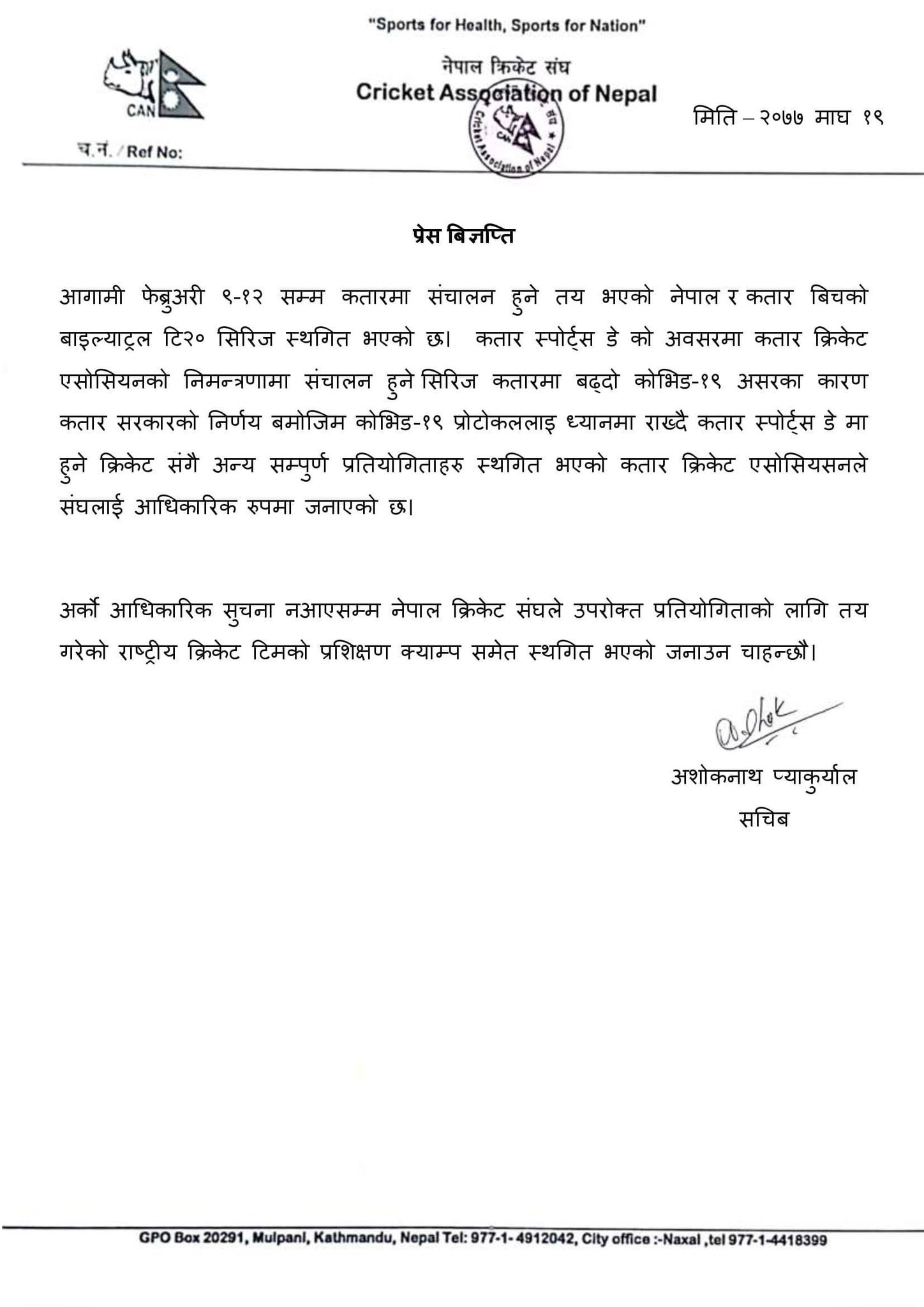 क्यानले सोमबार सूचना जारी गर्दै नेपाल र कतारबीचको सिरिज स्थगित भएको जानकारी दिएको हो । नेपालले कतारसँग कतार स्पोर्ट्स डेको अवसरमा फेब्रुअरी ९ देखि १२ सम्म द्विपक्षीय टी२० सिरिज खेल्ने तालिका रहेको थियो ।