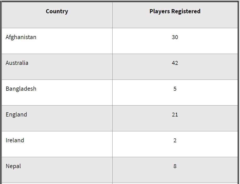 भारतीय क्रिकेट बोर्ड (बीसीसीआई)ले शुक्रबार जारी गरेको सूचीअनुसार नेपालबाट ८ खेलाडी अक्सनमा परेका हुन् । अक्शनमा पर्ने खेलाडीहरुको नाम भने सार्वजनिक गरिएको छैन ।