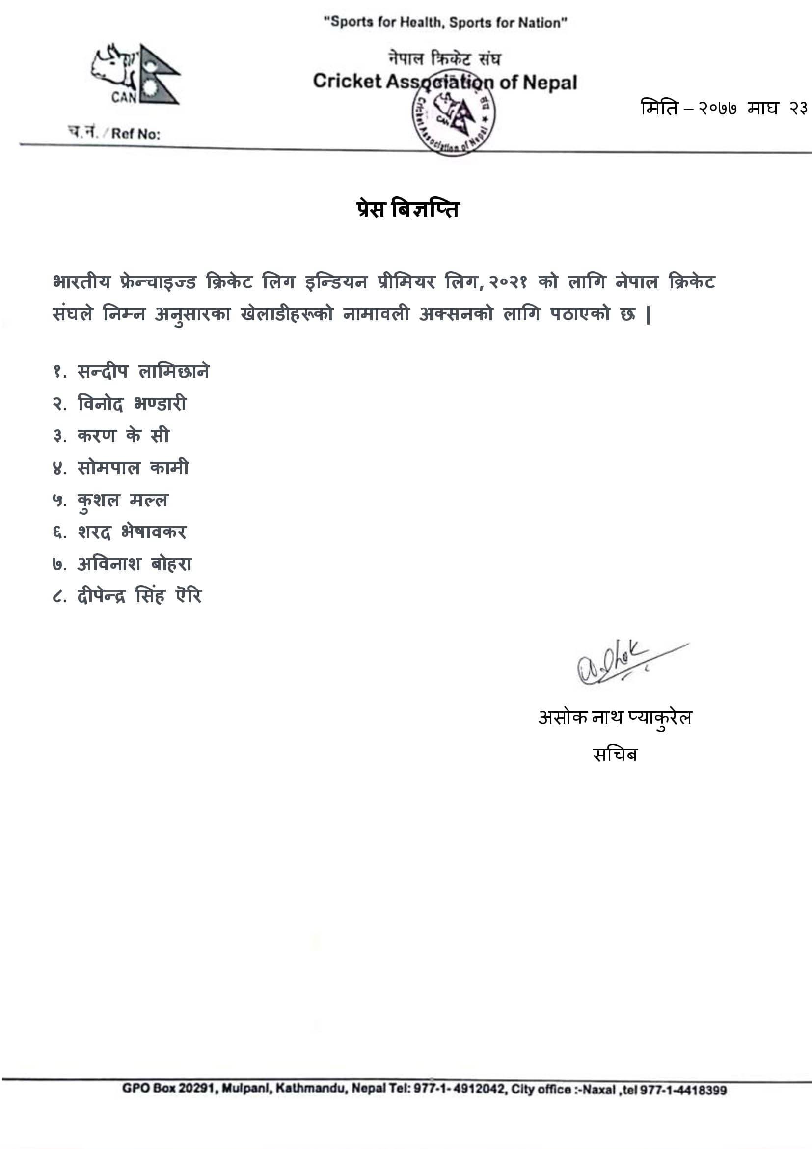 भारतीय क्रिकेट बोर्ड (बीसीसीआई)ले शुक्रबार जारी गरेको सूचीअनुसार नेपालबाट ८ खेलाडी अक्सनमा परेका हुन् । नेपाल क्रिकेट संघले अक्शनमा परेका आठ खेलाडीको नाम सार्वजनिक गरेको छ । क्यानले अक्शनमा सन्दीप लामिछाने, विनोद भण्डारी, करण केसी, सोमपाल कामी, कुशल मल्ल, शरद भेषावकर, अविनाश बोहरा र दीपेन्द्र सिंह ऐरीकोे नाम पठाएको जनाएको छ ।