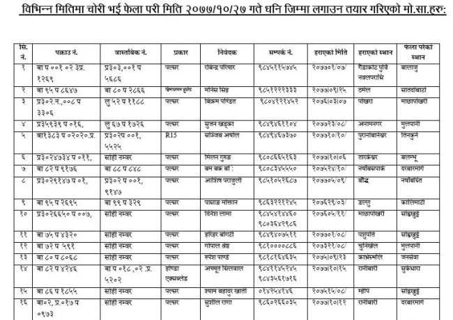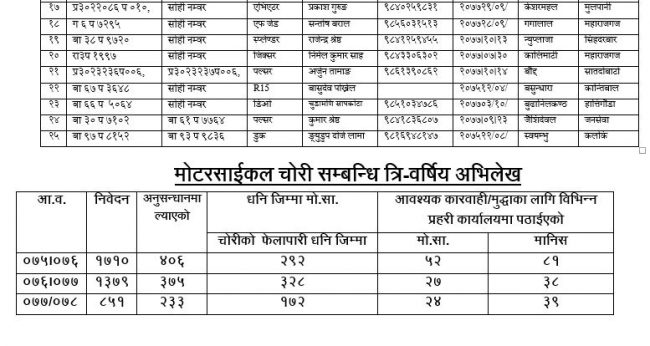 उपत्यकाका बालाजु, टोखा, सात दोबाटो, माछापोखरी, मूलपानी, तिनकुने, बलम्बु, दरबारमार्ग, बौद्ध, कालीमाटी, महाराजगञ्ज, कलङ्कीलगायत स्थानबाट मोटरसाइकल फेला फेला पारेर आज हस्तान्तरण गरिएको हो । सादा पोशाकमा प्रहरी परिचालन गरेर हराएका मोटरसाइकल तथा स्कुटर खोजीलाई तीव्रता दिइएको महाशाखाका प्रमुख एसएसपी भट्टराईले बताए । उनले जथाभावी मोटरसाइकल पार्किङ गर्दा चोरी हुने गरेकाले सवारी साधनमा अतिरिक्त लक प्रयोग गर्न, साइरनलगायतका उपकरण जडान गर्नसमेतसुझाव दिएका छन् ।