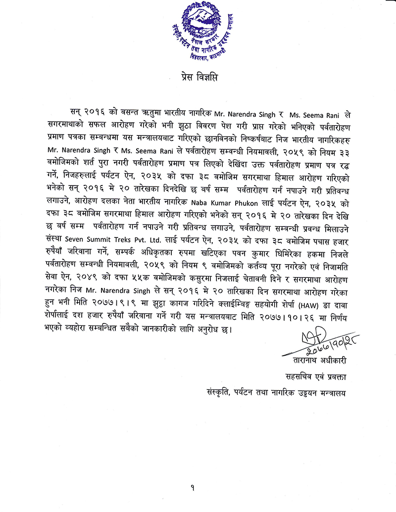 काठमाडौं । सन २०१६ मा सगरमाथा चढेको भनी झुठो विवरण पेश गरेर प्रमाणपत्र लिने दुई भारतीयलाई संस्कृति, पर्यटन तथा नागरिक उड्डयन मन्त्रालयले प्रतिबन्ध लगाएको छ । मन्त्रालयले विज्ञप्ति जारी गर्दै सन् २०१६ को वसन्त ऋतुमा भारतीय नागरिक नरेन्द्र सिंह र सीमा रानीले सगरमाथाको चुचुरोमा नपुगी आरोहणको प्रमाणपत्र लिएको पुष्टि भएको जनाएको छ ।