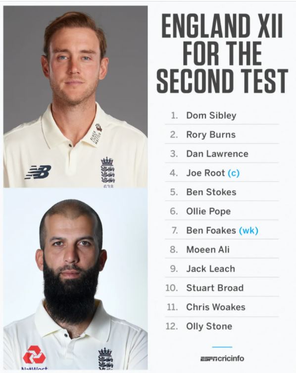 पहिलो टेष्टमा ५ विकेट लिएका बलर जेम्स एण्डरसनलाई आराम दिन लागिएको हो भने जोफ्रा आर्चर चोटका कारण बाहिर भएका छन् । आर्चरले दाहिने हातको कुहिनो चोट बोकेका छन् । यस्तै पहिलो खेलमा ५ विकेट लिएका डम बेस पनि टिम बाहिर रहेका छन् ।