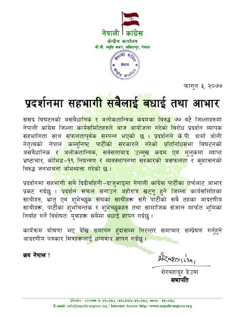 सभापति देउवाले विज्ञप्तिमार्फत प्रदर्शन सफल बनाउन अहोरात्र खट्ने पार्टी, भ्रातृ एवं शुभेच्छुक संस्थाका सदस्य र सामाजिक सञ्जालमार्फत भूमिका निर्वाह गर्ने युवालाई बधाई ज्ञापन गरेका छन् । साथै उनले कार्यक्रम घोषणा भएदेखि समापन हुँदासम्म निरन्तर समाचार सम्प्रेषण गर्ने सञ्चारकर्मीप्रति पनि धन्यवाद ज्ञापन गरेका छन् ।