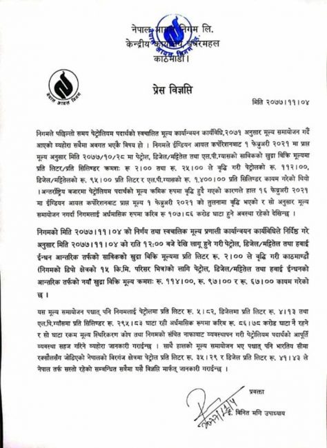 अन्तर्राष्ट्रिय मूल्यअनुसार समायोजन गर्ने क्रममा मूल्य वृद्धि गरिएको निगमले जनाएको छ । मूल्य समायोजन पश्चात् पनि निगमलाई पेट्रोलमा प्रतिलिटर पाँच रुपैयाँ ८२ पैसा, डिजेलमा प्रतिलिटरर चार रुपैयाँ १३ पैसा र खाना पकाउने एलपी ग्यासमा २९५ रुपैयाँ ८३ पैसा घाटा रहेको छ । अर्धमासिक रुपमा करिब ८६ करोड ७८ लाख घाटा नै रहने छ ।