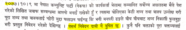 प्रधानमन्त्रीले राजनीतिक कार्यक्रममा आफ्ना विचार व्यक्त गर्दा अदालत, प्रधानन्यायाधीश, न्यायाधीशहरु तथा अदालतमा न्यायसम्पादनको लागि कार्यरत कर्मचारी एवं कानून व्यवसायीप्रति कुनै लाञ्छना नलगाएको जवाफमा उल्लेख गरेका छन्।
