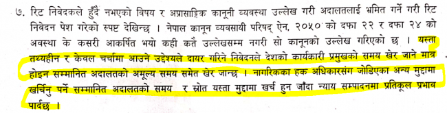 तथ्यहीन र केवल चर्चामा आउने उद्देश्यले दायर गरिने निवेदनले देशको कार्यकारी प्रमुखको समय खेर जाने मात्र नभई अदालतको अमूल्य समयसमेत खेर जाने र नागरिकका अधिकारसंँग जोडिएका अन्य मुद्दामा खर्चिनुपर्ने अदालतको समय र स्रोत यस्ता मुद्दामा खर्च हुन जाँदा न्याय सम्पादनमा प्रतिकूल प्रभाव पार्ने पनि जवाफमा उल्लेख गरिएको छ ।