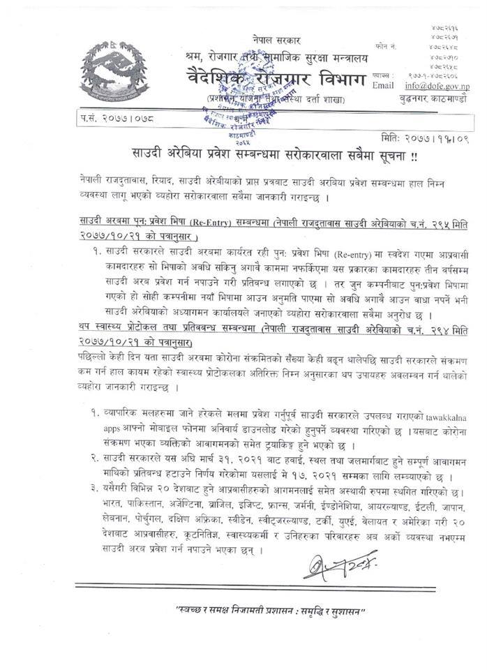 त्यस्तै, जुन कम्पनीबाट पुनः प्रवेश भिसामा गएको हो सोही कम्पनीमा नयाँ भिसामा जान अनुमति पाएमा सो अवधि अघि नै जान पाउने साउदी अरेबियाको अध्यागमन कार्यालयले जनाएको छ।