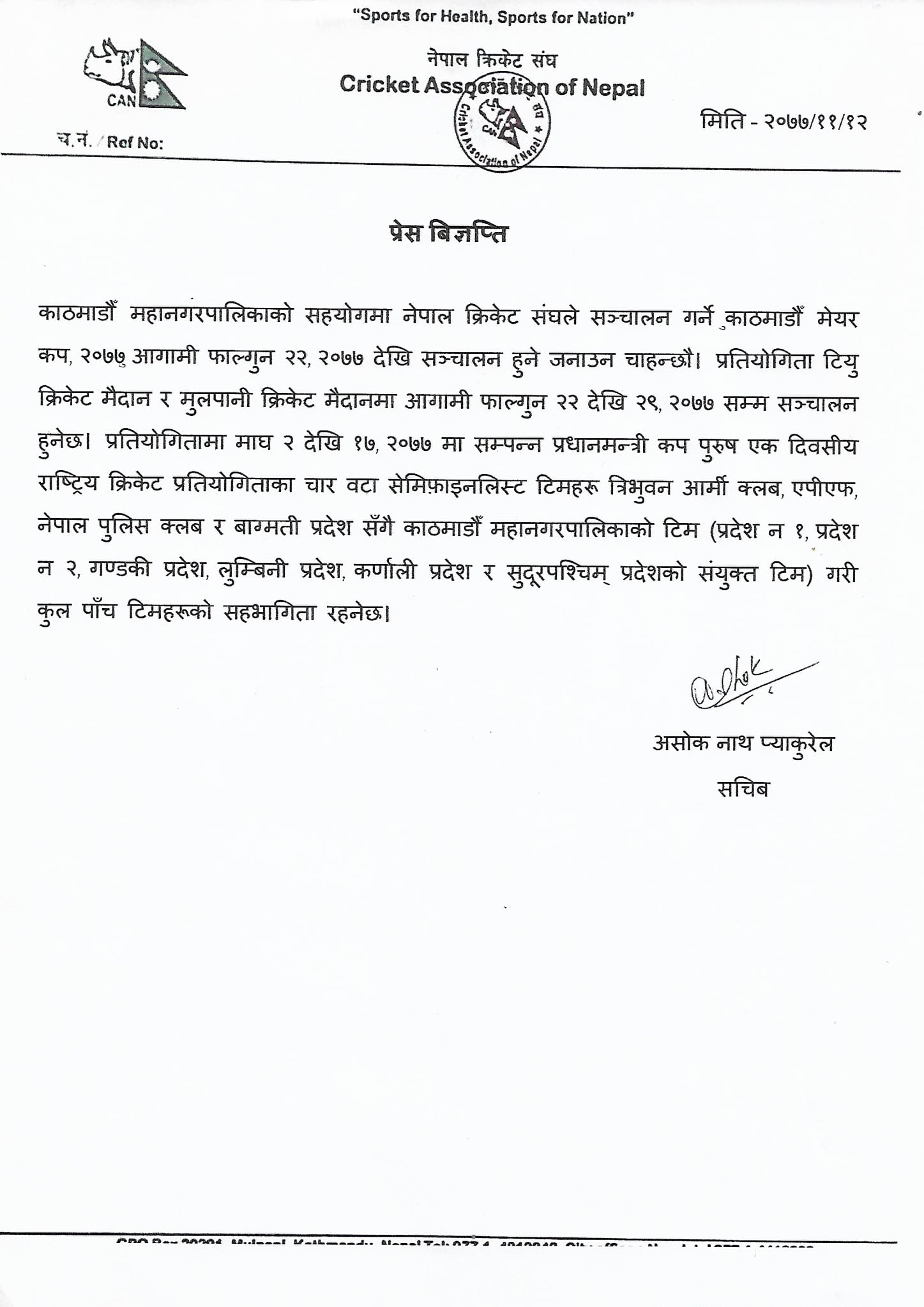 काठमाडौं । पहिलो संस्करणको काठमाडौं मेयर कप एकदिवसीय पुरुष क्रिकेट प्रतियोगिता फागुन २२ गतेबाट सुरु हुने भएको छ । नेपाल क्रिकेट संघ (क्यान)ले बुधबार प्रेस विज्ञप्ति निकाल्दै मेयर कप क्रिकेट फागुन २२ देखि २९ गतेसम्म हुने जनाएको छ ।