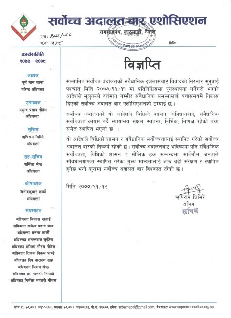 सर्वोच्च बारका सचिव ऋषिराम घिमिरेले आज विज्ञप्तिमार्फत सर्वोच्चको आदेशले विधिको शासन, संविधानवाद, संवैधानिक सर्वोच्चता कायम गर्दै न्यायालय सक्षम, स्वतन्त्र, निर्भिक र निष्पक्ष रहेको तथ्य स्थापित भएको उल्लेख गरेका छन् ।