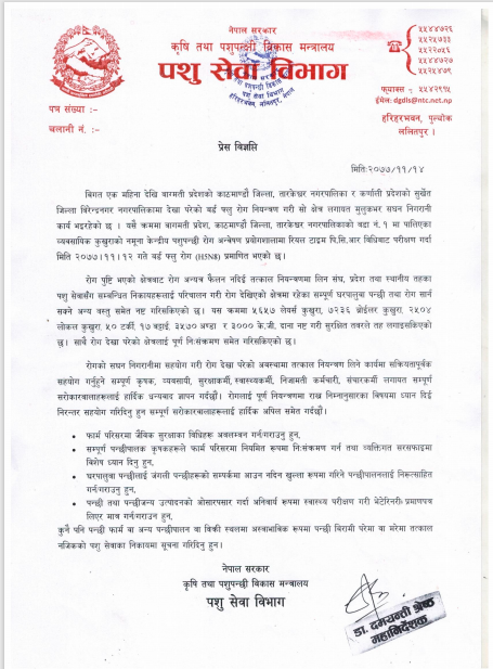 बर्डफ्लु फैलिन नपाओस् भनेर विभागले सम्बन्धित सबैका लागि चारबुँदे अपिल जारी गरेको हो।