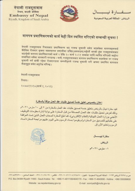 काठमाडौं। साउदीको लागि मागपत्र प्रमाणीकरणको कार्य केहि दिनका लागि स्थगित भएको छ। सोमबार साउदीस्थित नेपाली दूतावासले सूचनामार्फत केही दिनको लागि मागपत्र प्रमाणीकरण कार्य स्थगित गरिएको जानकारी गराएको हो।