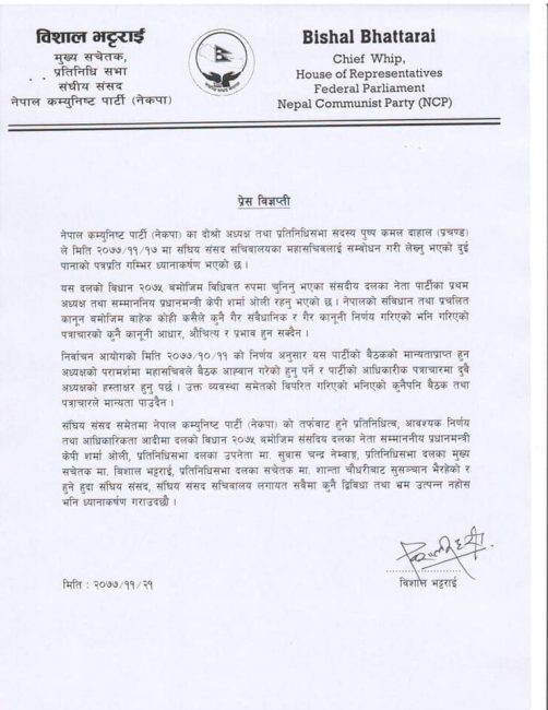 भट्टराईले एक विज्ञप्ति जारी गरि दलको विधान बमोजिम विधितव रूपमा निर्वाचित संसदीय दलका नेता तथा पार्टीका प्रथम अध्यक्ष केपी शर्मा ओलील रहेकाले अरु पत्र र दावी गैरकानुनी रहेको दावी गरेका छन्।