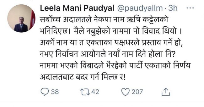 यसरी सर्वोच्च अदालतले एमाले र माओवादी केन्द्रलाई ब्युँताउने फैसला गरेपछि अदालतको सो फैसलमाथि टिकाटिप्पणी सुरु भएको छ। यसरी टिप्पणी गर्नेमा पूर्व मुख्यसचिव लीलामणी पौड्याल पनि छन्। उनले सामाजिक सञ्जाल ट्वीटरमा लेखेका छन्, ‘भइरहेको पार्टी एकीकरण निर्णय अदालतले बदर गर्न मिल्छ ?’