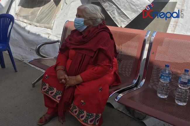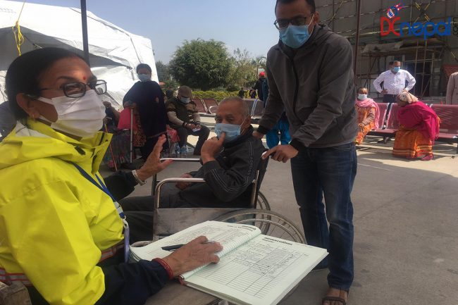 आफ्ना सन्तानको साहारामा अस्पताल आएका वृद्धवृद्धा कोही कोरोनाविरुद्धको खोप लगाउन लाइनमा थिए, कोही नाम लेखाउँदै थिए, कोही पालो कुरिरहेका देखिन्थे भने खोप लगाइसकेपछि धेरैजसो आराम गरिरहेका देखिन्थे।