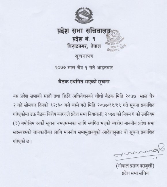 सचिव पराजुलीले सूचनामा भनेका छन्, ‘विशेष कारणले प्रदेश सभा नियमावली २०७४ को नियम ६ को उपनीय ३ बमोजिम अर्को सूचना नआएसम्मका लागि बैठक स्थगित भएको छ।’