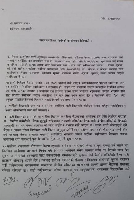 आइतबार सो समूहले निर्वाचन आयोगलाई पत्र लेख्दै अनाधिकृत बैठकबाट गरिएका निर्णयहरु कार्यान्वयन नगर्न आयोगसँग आग्रह गरिएको छ। शुक्रबार बसेको बालुवाटार बैठकले एमालेमा अध्यक्ष र महासचिबबाहेक सबै पदाधिकारी खारेज गर्ने निर्णय गरिएको छ। र माधव समूहका नेताहरुको जिम्मेवारी खोसेर आफू निकट नेताहरुलाई दिइएको छ। साथै माओवादी केन्द्रबाट आएका २३ जनालाई केन्द्रीय सदस्य मनोनित गरी जिम्मेवारीसमेत दिइएको छ।