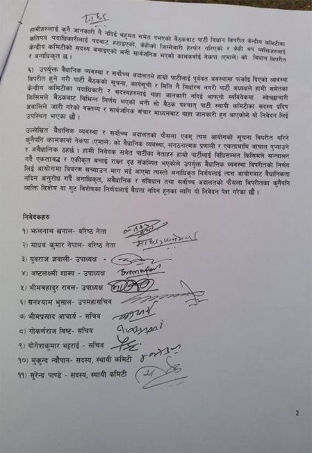 उनीहरुले आफूहरुसबै पार्टीको ९ औं महाधिवेशनबानट निर्वाचित भएको भन्दै आफूहरुलाई हटाउने निर्णय अवैध रहेको आयोगलाई जानकारी दिएका छन्।