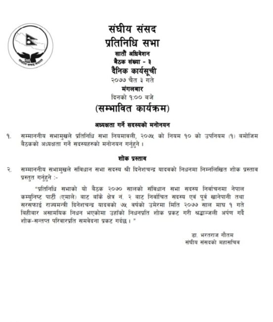 उता संसद सचिवालयले मंगलबार बस्ने बैठकको सम्भवित कार्यसूचीसमेत सार्वजनिक गरेको छ। मंगलबार दिउँसो १ बजे बस्ने बैठकको सम्भावित कार्यसूचीमा दुईवटा विषय रहेका छन्। सभामुख सापकोटाले बैठक सञ्चालनार्थ अध्यक्ष मण्डल मनोनित गर्ने र शोक प्रस्ताव पारित गर्ने सम्भावित कार्यसूची रहेको छ।