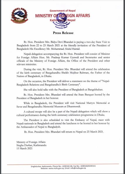 परराष्ट्रका अनुसार बंगलादेशका संस्थापक पूर्वराष्ट्रपति बंगबन्धु शेख मुजिबुर रहमानको सयौं जन्मजयन्तीका अवसरमा बंगलादेशमा हुने कार्यक्रममा सरिक हुनेछिन्। बंगबन्धुको जन्मजयन्ती समारोहलाई राष्ट्रपति भण्डारीले सम्बोधन गर्ने कार्यक्रम रहेको छ।