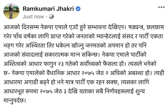 काठमाडौं। एमाले केन्द्रीय सदस्य रामकुमारी झाँक्रीले एमाले एक हुने सम्भावना नदेखिएको बताएकी छन्। सोमबार अबेर ट्वीट गर्दै उनले भनेकी छन्, ‘आजका दिनसम्म एमाले एक हुने सम्भावना देखिएन।’