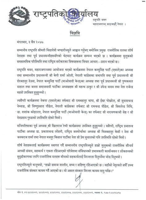 राष्ट्रपति कार्यालयले जारी गरेको विज्ञप्तिअनुसार राष्ट्रपति भण्डारीले शीर्ष नेताहरूलाई कार्यक्रममा स्वागत गर्दै हाम्रो मुलुकको राजनीतिक सौन्दर्य आपसी संवाद, सहकार्य र एकता रहिआएको परिवेशमा संविधानको प्रभावकारी कार्यान्वयन र लोकतन्त्रको सुदृढीकरणका लागि राजनीतिक दलहरू बीचको सहकार्यलाई निरन्तरता दिनुपर्नेमा जोड दिएकी थिइन्।